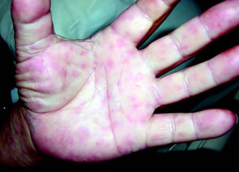 Figure 1 – This rash started on a 55-year-old man's forearms and legs and spread to his trunk (A), palms (B), and soles. He also had fever, headache, myalgia, arthralgia, and a history of a recent tick bite. Rocky Mountain spotted fever was diagnosed.