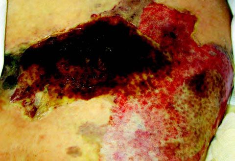 Figure 3 – Necrotizing fasciitis, seen here in an elderly woman with type 2 diabetes mellitus, is characterized by poorly defined margins of affected tissue that spread rapidly, with darkening of erythema to a reddish purple color. (Photograph courtesy of Noah S. Scheinfeld, MD, JD.)