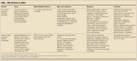 In the first 2 articles in this series, we addressed Rocky Mountain spotted fever, meningococcemia, and necrotizing fasciitis (CONSULTANT, November 2010, page 473) and staphylococcal toxic shock syndrome (TSS) and streptococcal TSS (CONSULTANT, December 2010, page 507). Here we focus on CNS infections (Table).