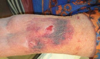 A 69-year-old man fell from his bicycle and presented with abrasions, ecchymoses, and a 3-cm laceration on his right leg. Septic shock and multiple tense hemorrhagic bullae developed. The patient was found to have infection with Morganella morganii.