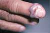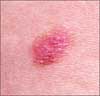Amelanotic melanomas are extremely difficult to diagnose clinically because of their lack of pigment. Closer examination reveals asymmetry of the erythema with perhaps a hint of pigment at the inferior aspect of the lesion.