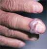 For 2 days, a 45-year-old woman has had a tender swollen finger after she chewed off a hangnail. She is otherwise healthy. She works as a housecleaner; one of the homes she cleans has 13 toilets. Which of the following do you suspect?