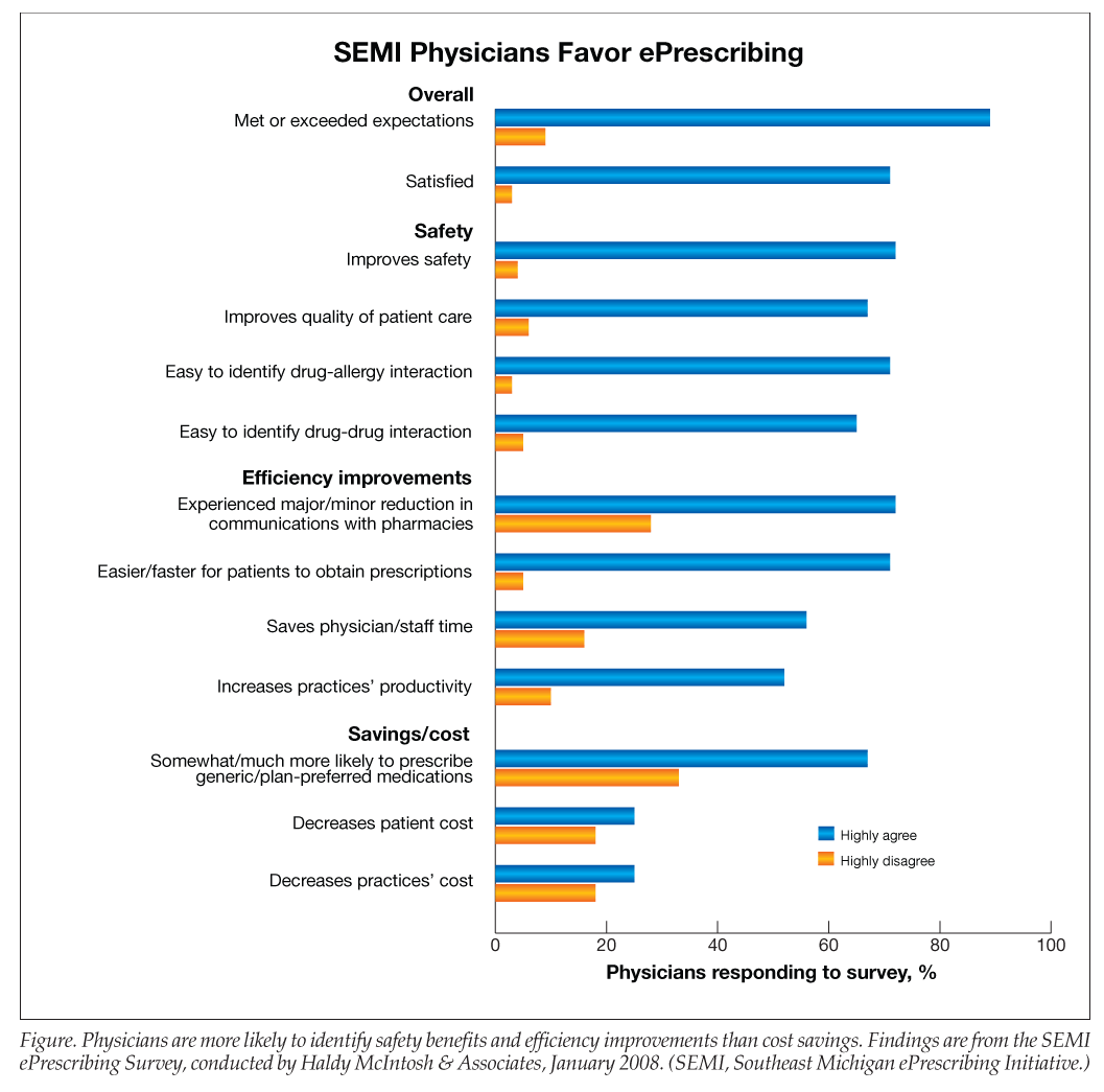 An example of such an initiative that has achieved impressive results is the Southeast Michigan ePrescribing Initiative (SEMI). While the primary objective of this employer-driven initiative is to encourage the adoption of ePrescribing in the greater Detroit metropolitan area, SEMI has also been analyzing the effect of the technology on patient safety and prescription drug costs. SEMI’s multiphase plan has integrated community outreach and financial incentives with training support to drive the expansion of ePrescribing in its target area. Since its inception, SEMI has enrolled more than 3000 physicians, who have transmitted nearly 9.5 million electronic prescriptions (SEMI internal data). In large part because of SEMI’s success, Michigan now ranks fifth among states in the adoption of ePrescribing.4
