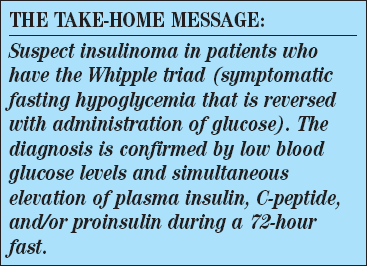 An abdominal CT scan showed a "normal pancreas," but endoscopic ultrasonography revealed a 9 x 10-mm hyperechoic mass in the body of the pancreas consistent with an insulinoma. The tumor was removed by laparoscopic enucleation and was shown to be benign. One year after the procedure, the patient is doing well and has had no recurrent symptoms.