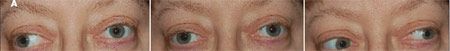 Examination revealed visual acuity of 20/40 in the right eye and 20/60 in the left eye, symmetrical 5-mm pupils, and no ptosis of either eyelid. Assessment of extraocular motility showed an adduction deficit of the left eye (A). Horizontal nystagmus occurred in the right eye with extreme right gaze. Left internuclear ophthalmoplegia was diagnosed, and a full neurological workup was undertaken.