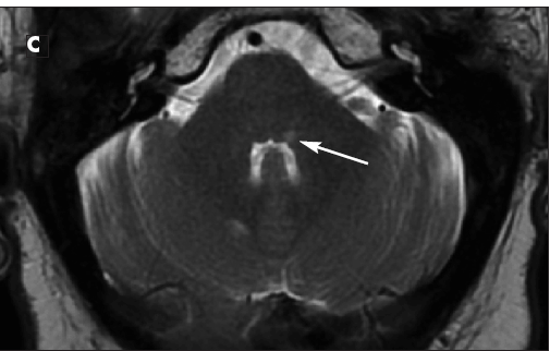 For a month, an obese 50-year-old woman with type 2 diabetes mellitus, hypercholesterolemia, and hypertension had blurry vision in both eyes. During this time, she also had ataxia and right-sided numbness. For the past 2 days, she had had horizontal, binocular diplopia with right gaze.