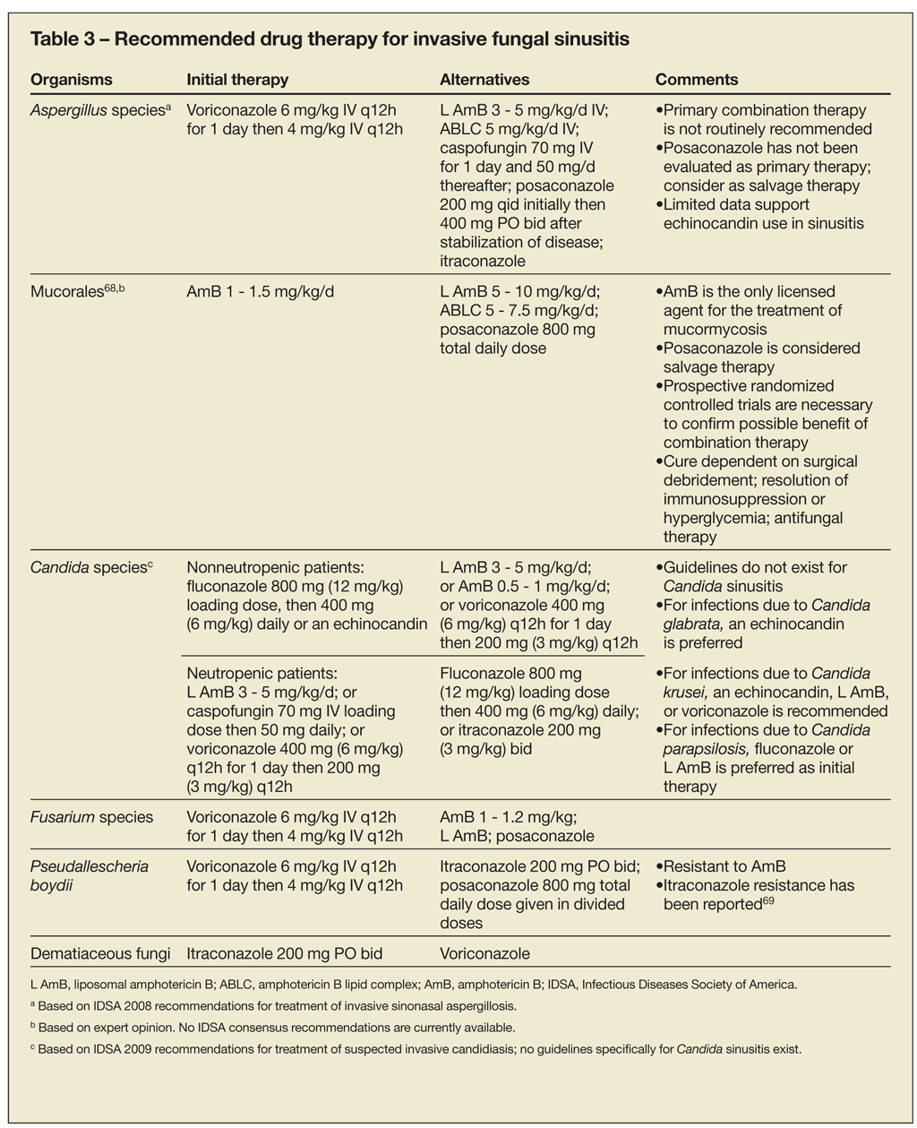 Although few trials provide information on the treatment of Aspergillus sinusitis, voriconazole is now considered first-line therapy (Table 3).39,40 However, if the etiological organism remains unknown or histopathological results are still pending, initial therapy with an amphotericin B formulation should typically be ad