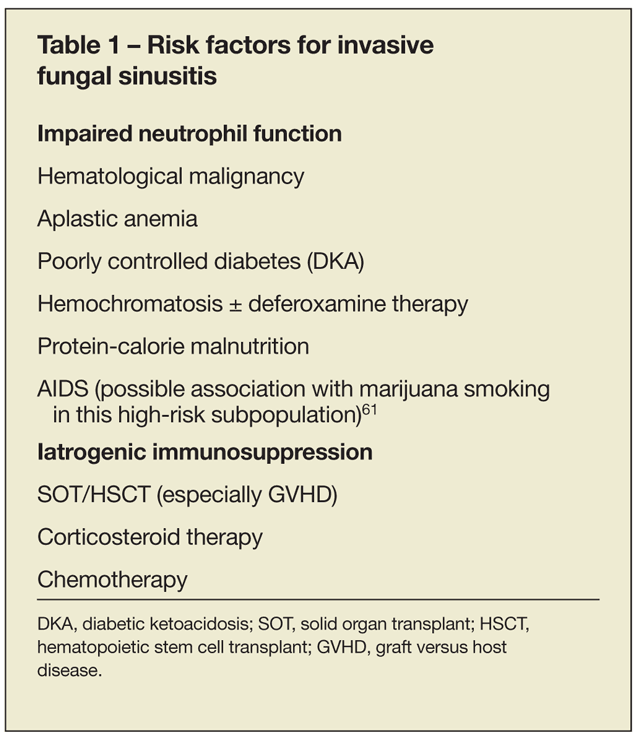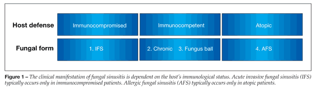 With advances in chemotherapy, transplantation, and the treatment of diabetes and HIV infection, fungal sinusitis has become increasingly recognized in patients in these at-risk groups. In immunocompetent patients, fungal sinus disease is generally limited to 1 of 3 categories: