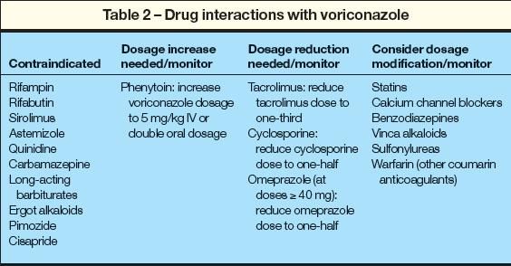 Potential adverse effects of voriconazole are visual disturbances, including blurred vision, changes in acuity and color, and photophobia, all of which can occur in up to 20% of patients but are transient and do not lead to permanent problems. Liver function abnormalities occur in about 12% of cases. Our routine is to order liver function tests approximately once per month. Other, less common effects are fever, chills, headache, tachycardia, nausea, vomiting, hallucinations, and rash. The potential for drug interactions should always be considered before starting voriconazole, and appropriate adjustments should be made (Table 2).