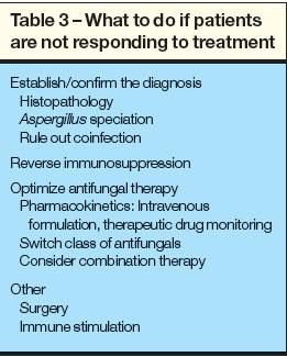 Careful monitoring is required during therapy. The volume of pulmonary infiltrates may increase for the first 7 to 10 days of therapy, especially in the context of granulocyte recovery.16 For patients not responding, several factors should be considered (Table 3):