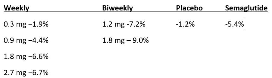 Analysis of bodyweight reductions of ≥5% and ≥10% for the 3 groups found the following proportions achieving each goal: 57% and 35%, respectively, of those treated with BI 456906 1.8 mg biweekly, 6.8% and 0%, respectively, for those receiving placebo, and 38% and 16%, respectively, for participants in the arm receiving semaglutide 1.0 mg once weekly.