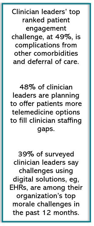 Clinician leaders’ top ranked patient engagement challenge, at 49%, is complications from other comorbidities and deferral of care. When patients do access care, getting them to stick with it can also be tricky. The second-ranked patient engagement challenge, selected by 48% of leaders, is encouraging patient adherence to treatment plans.