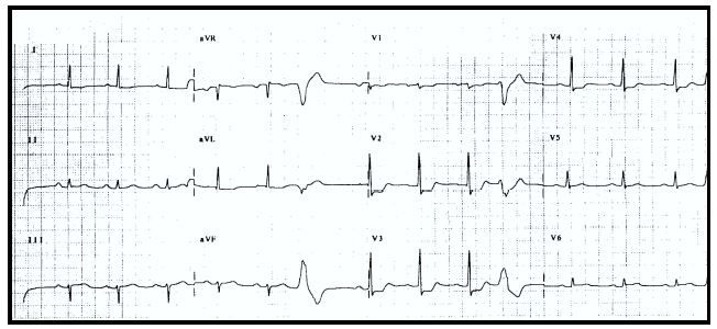 On examination, he was alert, oriented, anxious, and in moderate distress with significant diaphoresis. Vital signs were blood pressure, 118/88 mm Hg; pulse, approximately 80 beats/min; respiratory rate, 28 breaths/min; temperature, 37.1°C (98.8°F); and oxygen saturation, 94% on room air. The ECG monitor demonstrated the normal sinus rhythm with occasional premature ventricular contractions. The cardiac and pulmonary examinations were normal; the remainder of the examination was unrevealing. A 12-lead ECG was performed (Figure 1). Laboratory studies were obtained and a chest radiograph was ordered.