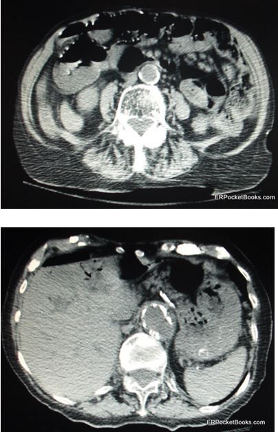 The CT scan of the abdomen showed evidence of severe ischemic colitis involving the transverse and descending colon with pneumatosis intestinalis. There is a small amount of free air from perforation which appears black at the upper part of the Figures. There is also portal venous gas, the black-appearing air within the liver from gas draining out of the colon into the liver. Finally, the aorta appears calcific and somewhat enlarged but without evidence of leakage.