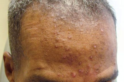 This HIV-positive, 48-year-old man presented with new-onset acne-like, pruritic lesions on his face. These erythematous painful papules had developed 2 months before presentation. Most patients with this condition are men in their 30s and 40s, who complain of a chronic, edematous, follicular eruption involving the trunk and face.