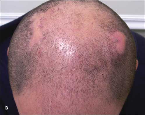 A 26-year-old man had recurring cystic lesions on his scalp that would periodically enlarge, shrink, and occasionally drain. Examination revealed a soft, fluctuant, nontender, nonerythematous subcutaneous swelling on the left parietal scalp and a larger, linear lesion on the right parietal scalp.