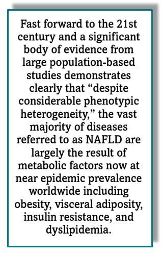 Fast forward to the 21st century and a significant body of evidence from large population-based studies demonstrates clearly that “despite considerable phenotypic heterogeneity,” the vast majority of diseases referred to as NAFLD are largely the result of metabolic factors now at near epidemic prevalence worldwide including obesity, visceral adiposity, insulin resistance, and dyslipidemia.