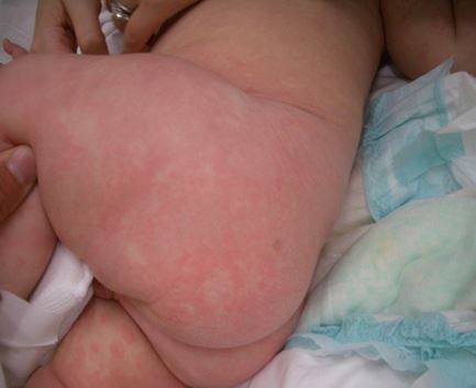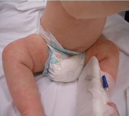 The parents of a fully vaccinated 7-month-old boy bring the child to the pediatrician’s office because he has had a fever and a rash for the past 4 days. They had been to an urgent care center the day before and were told that the fever and conjunctivitis that was noted were probably from a virus called adenovirus. Zinc oxide diaper cream was recommended for the diaper rash. Today the parents say he is more irritable and the rash looks worse despite frequent diaper changes and regular use of the zinc oxide diaper cream. The child also has a slight runny nose, but no vomiting, diarrhea, cough, trouble breathing, or other symptoms. He has been around other children his age, but as far as the parents know, none of them were ill.