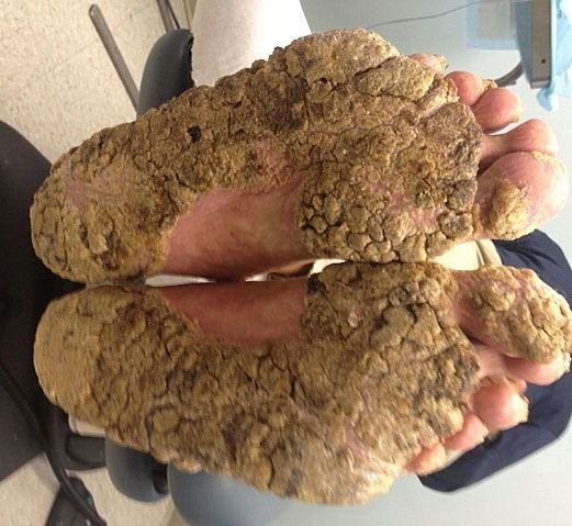 A 36-year-old man complained about his inability to walk because of extremely thickened soles. This condition had been present, to a variable degree, his entire life.