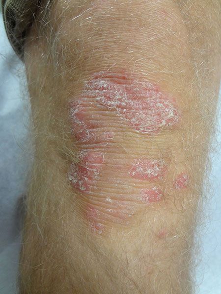 A 28-year-old man sought medical attention for a minimally pruritic “rash” on both knees. The eruption consisted of well-demarcated erythematous plaques covered by silvery scale.