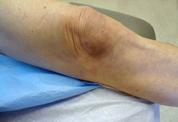 After an accident on the lawn, a large bruise developed over the knee of a 58-year-old woman who was otherwise in good health. The bruise had largely resolved within several weeks, but she sought medical care because of a persistently tender swelling just below and just medial to the inferior portion of the patella.