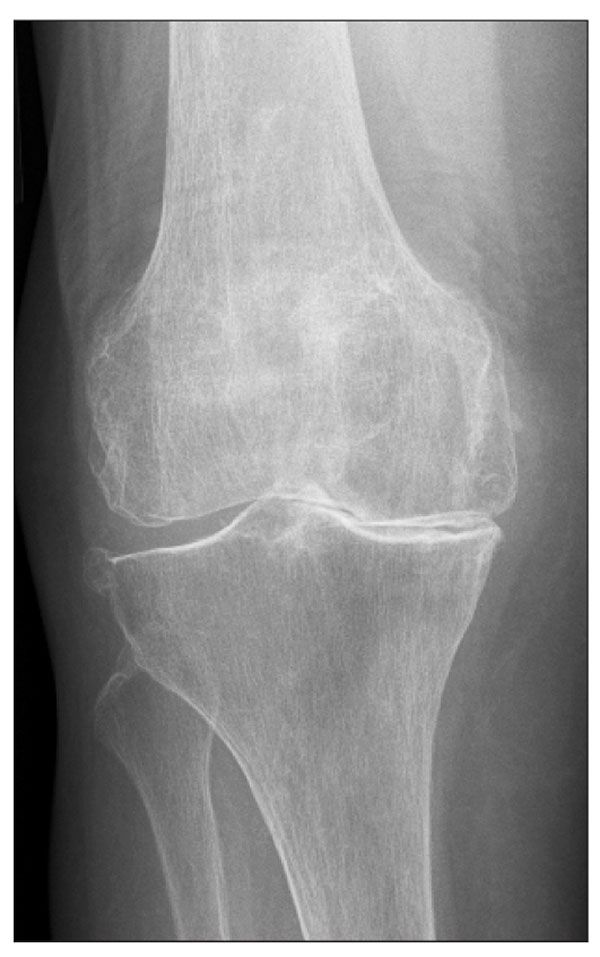 An 81-year-old man presented with a 1-year history of pain in his right knee. The pain had become more severe over the previous 2 months, but he denied any acute trauma or injury. The knee had limited range of motion. This anteroposterior x-ray view shows severe degenerative changes. The diagnosis was degenerative joint disease.