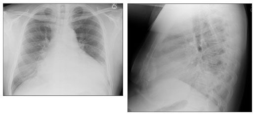 Figure 1. Chest radiographs showing left lower lobe infiltrate. (Images courtesy of the department of radiology, New York-Presbyterian Hospital-Weill Medical College of Cornell University.)