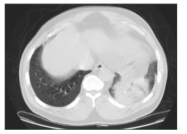 Figure 2.A CT scan of the chest showing left lower lobe consolidation with air bronchograms. (Image courtesy of the department of radiology, New York-Presbyterian Hospital-Weill Medical College of Cornell University.)
