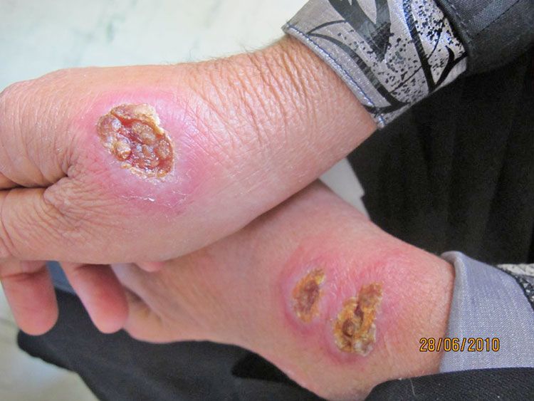 A 46-year-old immigrant from Iraq presented with 3 painless, crusted and inflamed ulcerations on his hands. Axillary adenopathy was absent, and he was otherwise in good health.