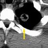 A CT scan of the lung apices revealed an inflammatory mass with an air signal, which was consistent with an abscess cavity (Figure 1). Blood cultures grew Fusobacterium necrophorum. The antibiotic regimen was switched to intravenous ticarcillin/clavulanate and clindamycin.