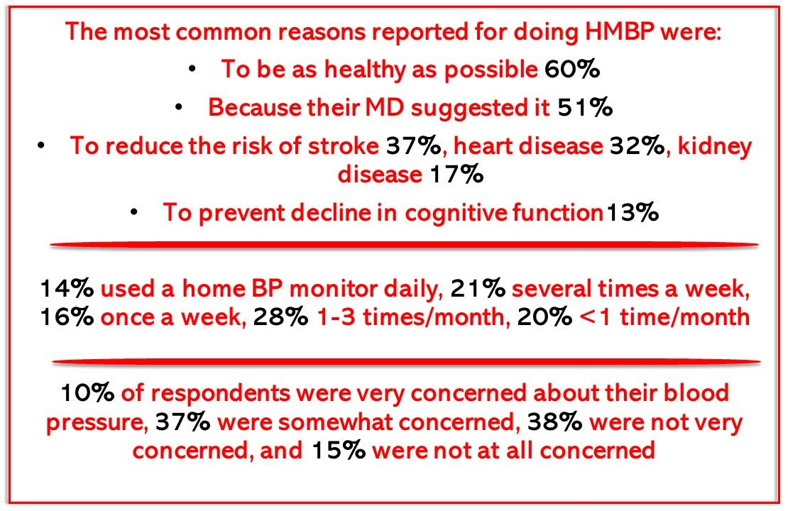 The survey found that 62% of this high-risk group had been instructed by a health care provider to periodically check their BP outside of a health care setting but less than half (48%) report regularly monitoring their BP.