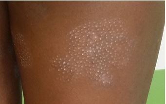 Physical examination revealed multiple spinous punctate papules grouped into dry, rough hypopigmented patches ranging from 1 to 4 centimeters in diameter (Figures 1 and 2). These were located mostly on the arms and legs with a few scattered on the back and abdomen; some had overlying excoriations. The new lesions on the hands and face (Figures 3 and 4) were less rough and scaly, and were flatter and less spinous.