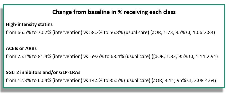 According to study findings, an absolute increase of 23.4% in prescriptions for all 3 recommended categories (ie, high-intensity statins, ACE inhibitors or ARBs, and sodium-glucose cotransporter 2 [SGLT2] inhibitors and/or glucagon-like peptide 1 receptor agonists [GLP-1RAs]) in the intervention vs the usual care group was “more than twice the improvement the trial was designed to detect,” according to study authors.