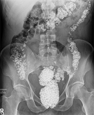 Abdominal x-ray films showed small radio-opaque foreign bodies scattered throughout the entire colon.