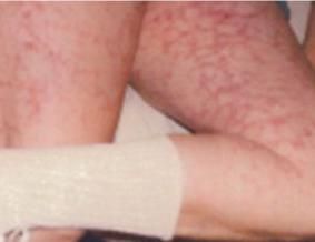 A 62-year-old woman was evaluated in preparation for cholecystectomy. She had no cardiac or pulmonary disorders. The physical examination was unremarkable other than a purplish red lace-like pattern on the skin. The mottling was most prominent on the thighs (Figure) and forearms. She had been experiencing the rash for 3 years and said that it becomes more pronounced when she is exposed to cold. The lesions caused no itching or pain.