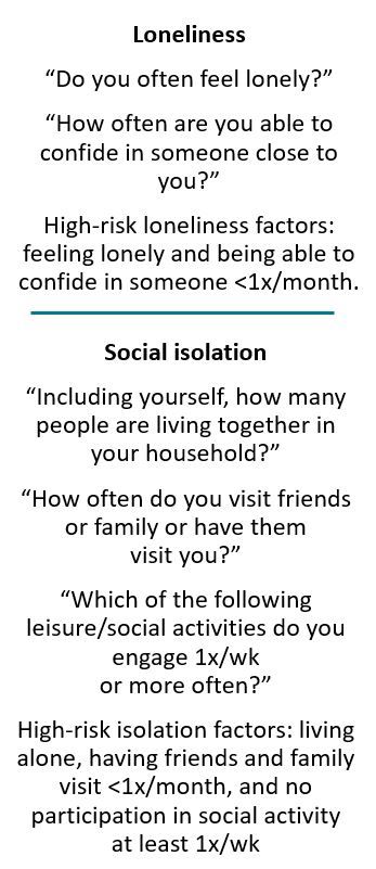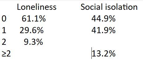 The team reported the proportions of participants with loneliness and social isolation scores as follows: