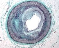 Figure. Low magnification micrograph of the distal right coronary artery with complex atherosclerosis and luminal narrowing; source: Nephron, Wikimedia Commons.