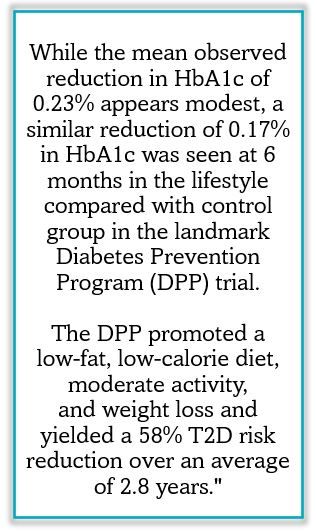 The researchers note that while the mean observed reduction in HbA1c of 0.23% appears modest, a similar reduction of 0.17% in HbA1c was seen at 6 months “in the lifestyle compared with control group in the landmark Diabetes Prevention Program (DPP) trial. The DPP promoted a low-fat, low-calorie diet, moderate activity, and weight loss and yielded a 58% T2D risk reduction over an average of 2.8 years."