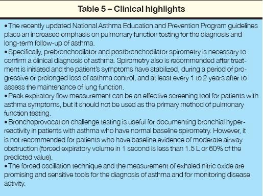 A variety of alternative agents and BPC methods have been developed, most of which offer improved specificity but decreased sensitivity compared with methacholine. The forced oscillation technique and exhaled nitric oxide measurements show significant promise as tools that are more sensitive to measure small-airway changes and inflammation, although further research is required to refine these techniques and to validate their effect on asthma outcomes. Clinical highlights are presented in Table 5.