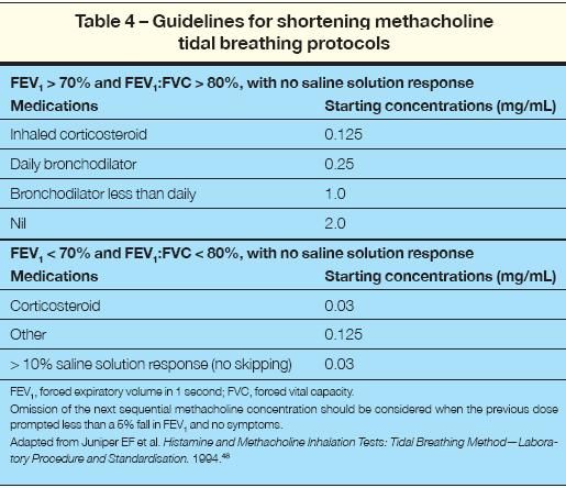 Other authorities recommend omission of the next sequential methacholine concentration in the dosing schedule if the previous dose resulted in less than a 5% fall in FEV1 and in no symptoms. Retrospective data support the safety of these practices.16,17