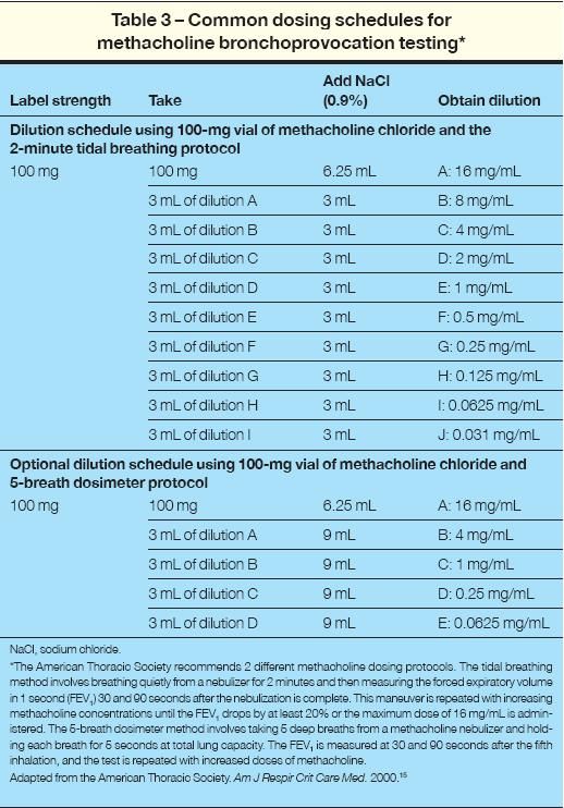 BPC protocols involve the inhalation of up to 5 or 10 sequentially increasing concentrations of methacholine and the measurement of FEV1 and subjective symptoms after each dose (Table 3). Testing stops if a maximum methacholine concentration of 16 mg/mL is reached without a significant change in lung function; a fall in FEV1 of more than 20% from baseline at any time during the test constitutes a positive result. Lower PC20 values (the dose of methacholine that is required to decrease FEV1 by 20%) are associated with greater evidence of airway hyperresponsiveness.