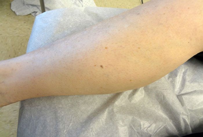 Key point: During the examination, a 5 × 3-mm pigmented macule was noted on the anteromedial aspect of the right foreleg. Most important, the asymptomatic lesion had a small spot of eccentric darker pigmentation. The patient was unaware of the questionable growth.