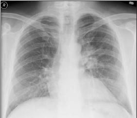 Figure 1 – A left perihilar infiltrate with enlargement of the left hilum can be seen in this posteroanterior chest radiograph. The patient had fever, malaise, and cough.