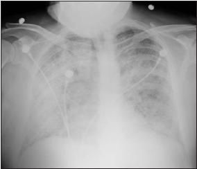 Later that day, the patient became more dyspneic with a concurrent drop in oxygen saturation, requiring an increase in oxygen supplementation. A chest radiograph revealed diffuse alveolar infiltrates (Figure 2).