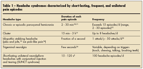 The pattern of this patient’s headaches bears close scrutiny. His headaches have certain clinical features that suggest a group of chronic headache syndromes characterized by attacks that are short-lasting, frequent, and unilateral (Table 1). Initially, attention needs to be directed to the most typical and the most unusual headache signs for this patient-such as the duration of the acute attack, the frequency, and the location.