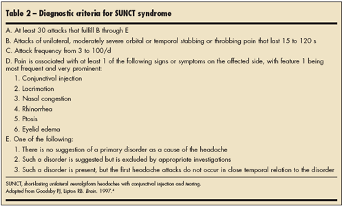 The clinical criteria for the diagnosis of SUNCT syndrome were suggested by Goadsby and Lipton4 in 1997 (Table 2).