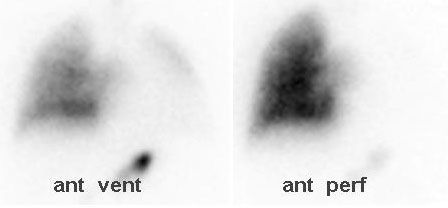 V/Q lung scans characteristically show complete absence of perfusion to the affected lung coupled with diminished ventilation on the wash-in and equilibrium phases but no delay in the wash-out phase of the ventilation scan.2 V/Q lung scans are typically used preoperatively to predict postoperative lung function.6 The gold standard, pulmonary angiography, should be reserved for patients who are undergoing embolization for hemoptysis or being considered for revascularization surgery.6