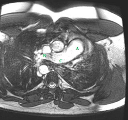Echocardiography is useful for excluding other cardiac anomalies and for screening for pulmonary hypertension. Contrast-enhanced high-resolution CT and MRI have proved valuable as well. The advantage of combined 3-dimensional cine gradient echo MRI and magnetic resonance angiography using gadolinium is that there is no radiation. Also, findings from these studies have excellent correlation with findings from cardiac catheterization and echocardiography.6 Right-sided and left-sided heart catheterization are generally used for evaluation of pulmonary hypertension.