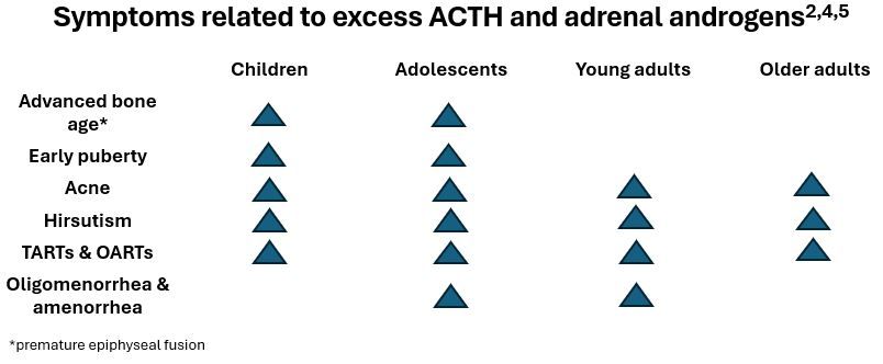 Adrenal Androgen Excess. Sequelae of adrenal androgen excess during childhood include virilization, accelerated somatic growth with advanced bone age, precocious puberty, and failure to achieve average adult height.2-4 Typical symptoms among adult women are hirsutism, acne, and irregular menses; among men testicular adrenal rest tumors (TARTs) are common. Hypogonadism and infertility may affect both men and women, either alone or together.1-3