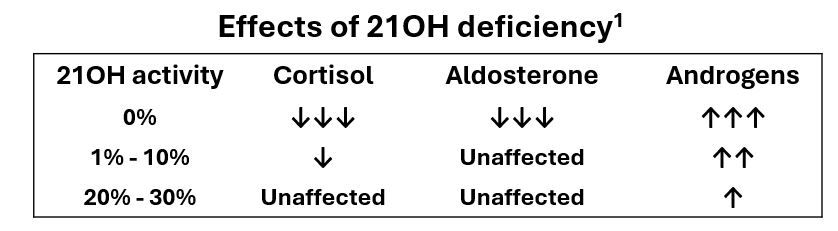 CAH is a group of autosomal recessive disorders that lead to complex hormonal imbalances related to enzyme deficiencies in the adrenal steroidogenic pathway. Between 95% to 99% of diagnosed cases are caused by 21-hydroxylase deficiency (21OHD), which is in turn caused by CYP21A2 gene mutations.1-5 The myriad CYP21A2 allelic variants are associated with a broad spectrum of phenotypes.1,3 Deficiency of 21OH leads to marked cortisol deficiency and the majority of affected individuals, to aldosterone deficiency.3 Regardless of degree of 21OH deficiency, however, the result common to all types is excessive adrenal androgens.1-5